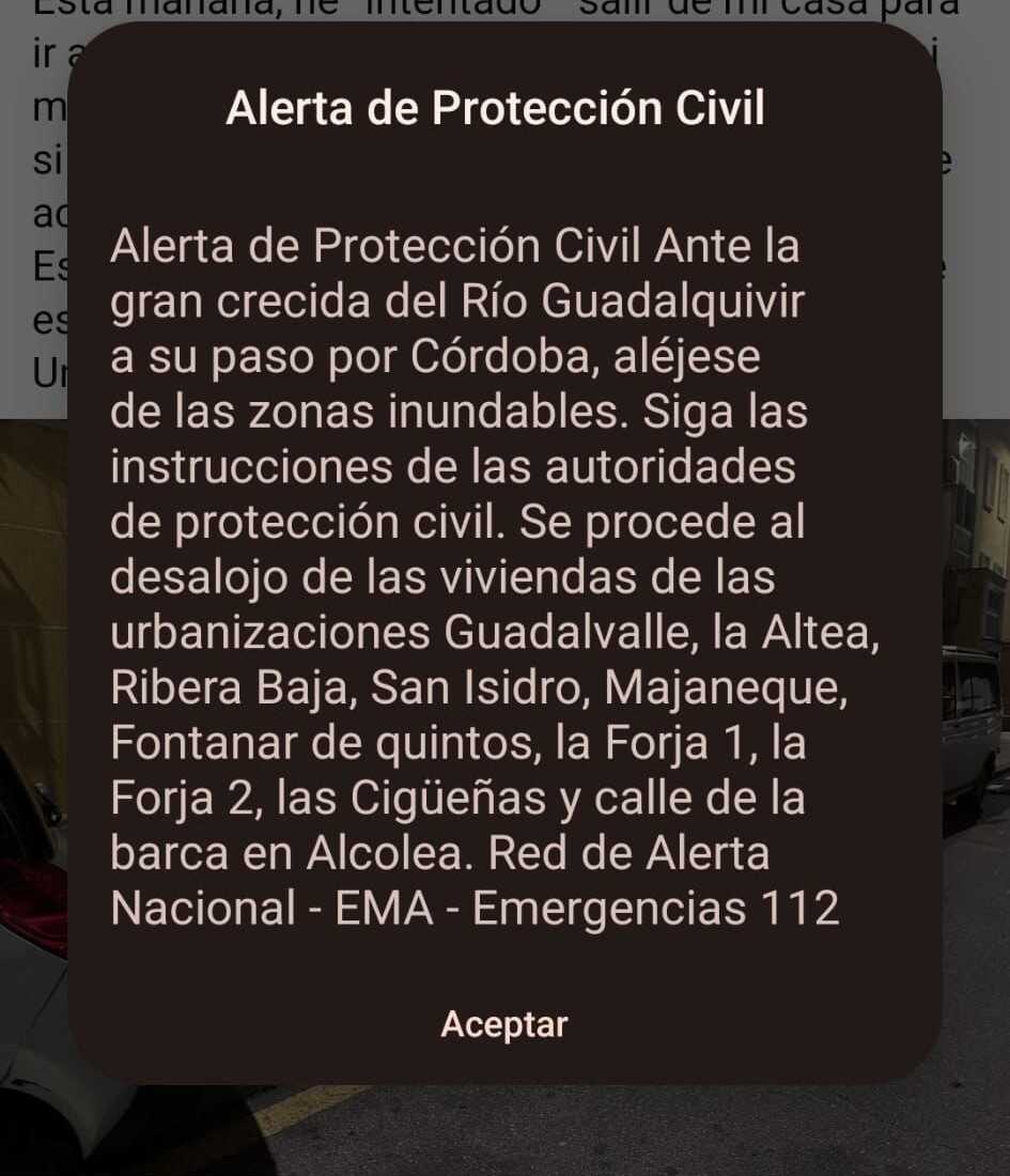 El aviso Es-Alert difundido en Córdoba solicita el desalojo de viviendas situadas en áreas con riesgo de inundación. El texto del mensaje insiste en que se eviten las zonas inundables y se atiendan las instrucciones de Protección Civil, ante la gran crecida del río Guadalquivir a su paso por la ciudad.