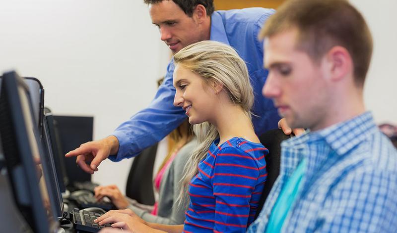 Side view of teacher showing something on screen to student in the computer room