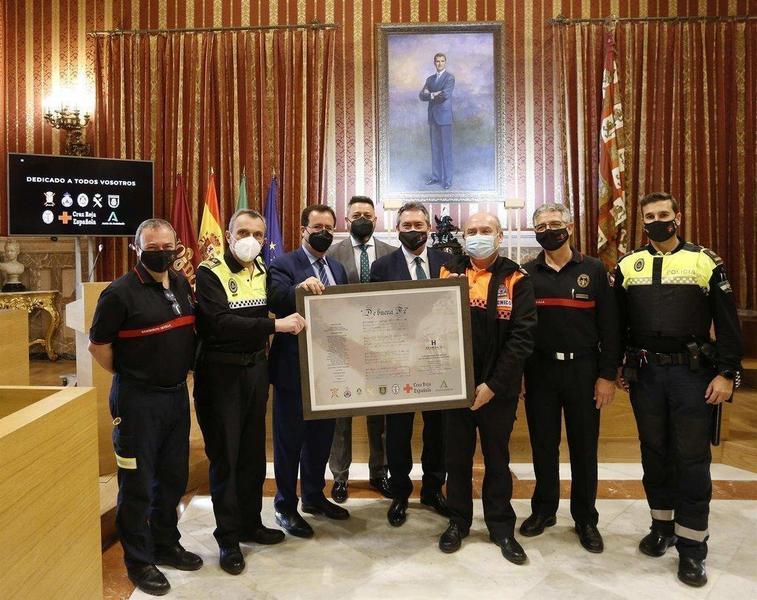 El alcalde de Sevilla, Juan Espadas, ha asistido, junto al delegado de Gobernación y Fiestas Mayores, Juan Carlos Cabrera, al estreno en el Salón Colón del Ayuntamiento de Sevilla de la marcha procesional 'De buena Fe', una obra colectiva del grupo de compositores Harmonía en homenaje al papel desempeñado por las fuerzas y cuerpos de seguridad y por el colectivo de sanitarios durante la pandemia.
