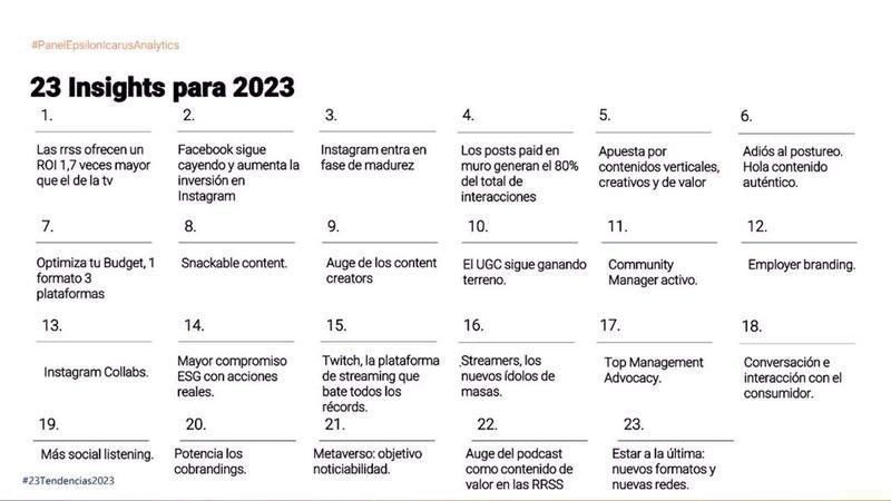 La consultora de negocios digitales Epsilon Technologies ha presentado '2023: un nuevo paradigma en redes sociales', un estudio en el que recoge cuáles serán las 23 tendencias que marcarán el paso en redes sociales los próximos meses. El objetivo del estudio es ayudar a los equipos de digital a anticipar sus estrategias para poder empezar el próximo año con un smart plan enfocado a ganar penetración en el mercado y digital mental availability.