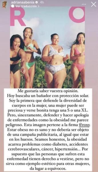Adriana ha incendiado las redes sociales por sus declaraciones sobre la campaña. “Hacer apología de enfermedades como la obesidad me parece peligroso” ha escrito en su cuenta de Instagram con una foto de las modelos.