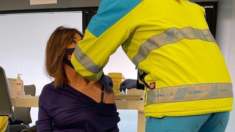 La presentadora ha acudido a vacunarse portando la bandera de su equipo, el Atlético de Madrid, para tener la suerte de su lado. Su turno le ha llegado cerca de las 11 y ha sido retransmitido en directo en su programa, llegando a interrumpir el debate que estaban teniendo en plató.