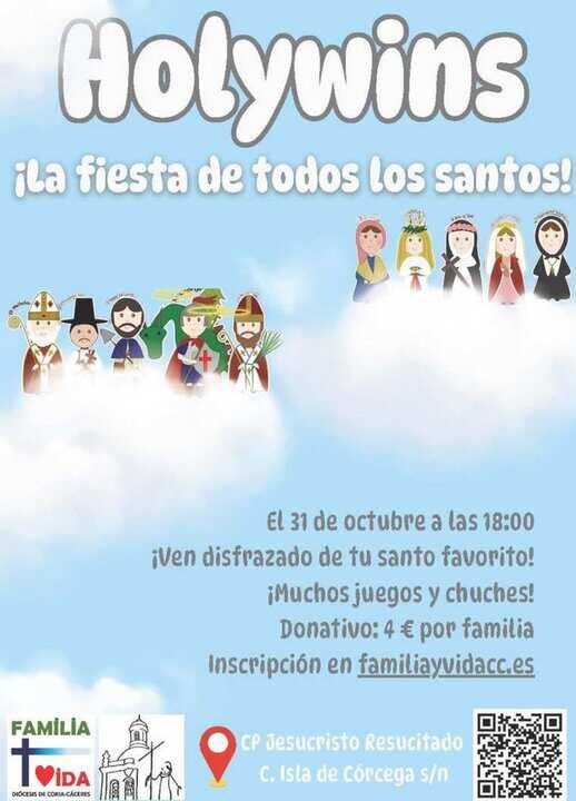 Además, en Coria-Cáceres, la Iglesia también ha querido sumarse un año más a esta "alternativa festiva y alegre a Halloween" que "recuerda el auténtico sentido cristiano de la víspera de Todos los Santos". El evento tendrá lugar este viernes a las 18:00 horas en el Centro Pastoral Jesucristo Resucitado, y los organizadores animan a los participantes a acudir disfrazados de su santo favorito. La inscripción tiene un donativo de 4 euros por familia.