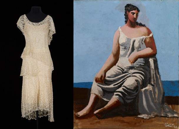 La muestra reúne una selección de vestidos, óleos, dibujos y otras piezas procedentes de museos y colecciones americanos y europeos, entre los que destacan la colaboración de Bernard Ruiz Picasso, Patrimoine de Chanel y el Musée National Picasso de París.