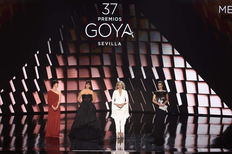 Las actrices de 'Belle Époque', Penélope Cruz; Maribel Verdú; Miriam Díaz-Aroca y Ariadna Gil, entregan el Goya a mejor película, en la 37 edición de los Premios Goya