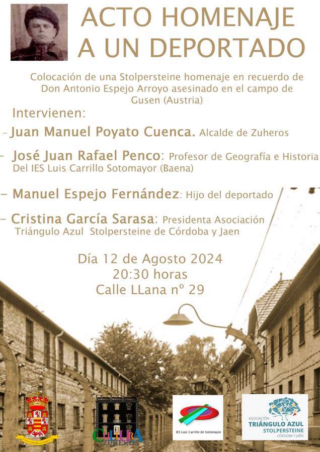 La colocación de la Stolperteine o piedra de la memoria tendrá lugar a las 20:30 horas en la calle Llana número 29. Al acto asistirán el alcalde de Zuheros, Juan Manuel Poyato Cuenca; Manuel Espejo Fernández, hijo del deportado; José Juan Rafael Penco, profesor de Geografía e Historia; y Cristina García Sarasa, presidenta de la Asociación Triángulo Azul Stolpersteine Córdoba y Jaén.
