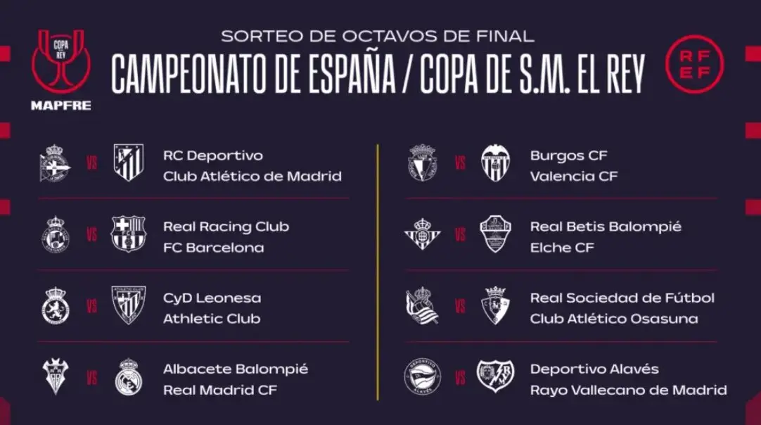 El resto de cruces de esta ronda también ha quedado definido en el mismo sorteo. Los emparejamientos que completan los octavos enfrentarán a la Cultural y Deportiva Leonesa con el Athletic Club, al Burgos CF con el Valencia CF, al Real Betis con el Elche CF, a la Real Sociedad con Osasuna y al Deportivo Alavés con el Rayo Vallecano.
