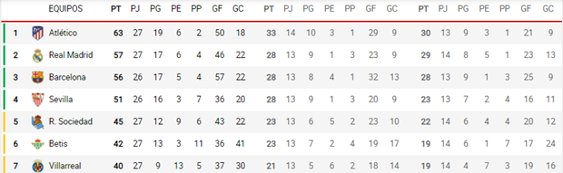 Este fin de semana se disputaba la 27ª jornada de LaLiga. El líder, el Atlético de Madrid, visitaba al Getafe, mientras que el Real Madrid recibía en casa al Elche, el cual se encontraba al borde del descenso.