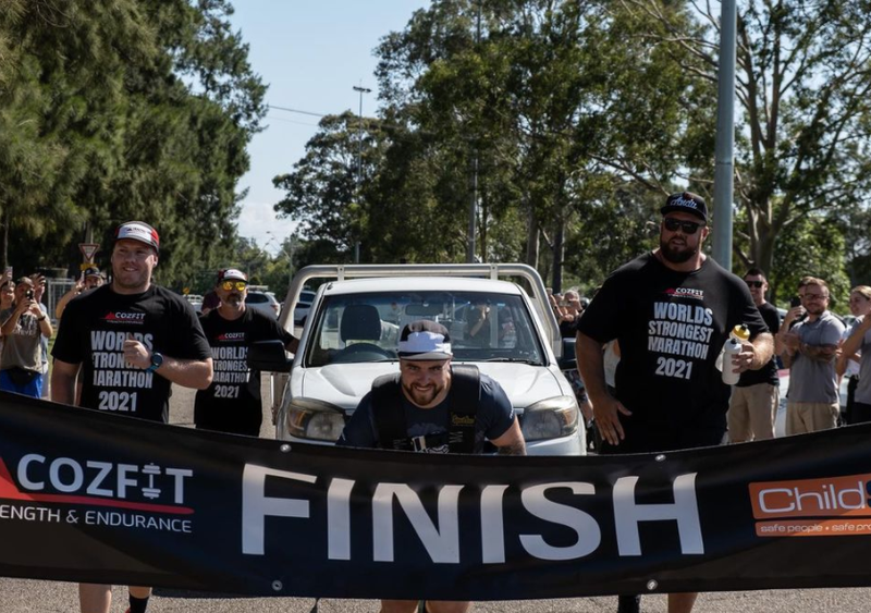 Arrastra durante un maratón de 42 kilómetros, una camioneta de 1.500 kilogramos. El nuevo récord se ha establecido en aproximadamente 16 horas. Todo el esfuerzo va dirigido a una causa solidaria: ayudar a los niños que sufren abusos.