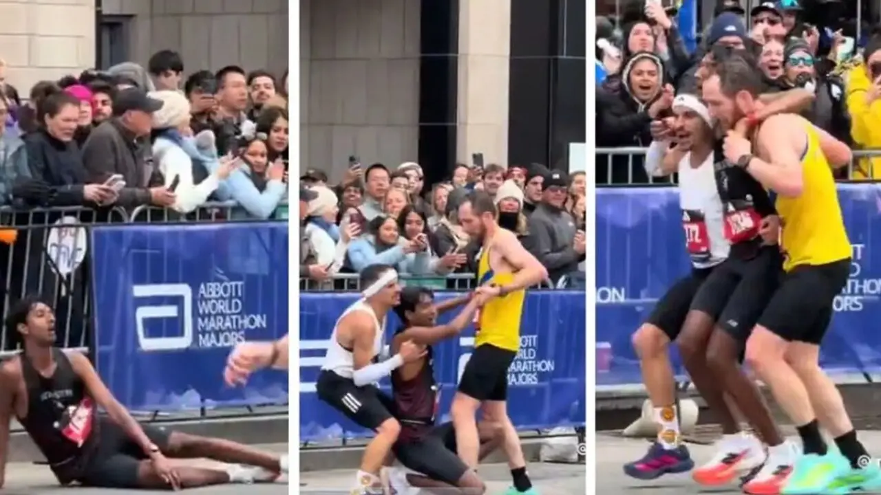 En las grabaciones se observa cómo la mayoría de corredores siguen de largo sin detenerse. Sin embargo, poco después aparece un atleta que se detiene para ayudar al joven a ponerse de pie, a pesar de que le cuesta bastante.