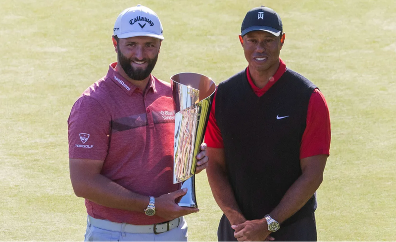 Jon Rahm posando con su trofeo junto a Tiger Woods