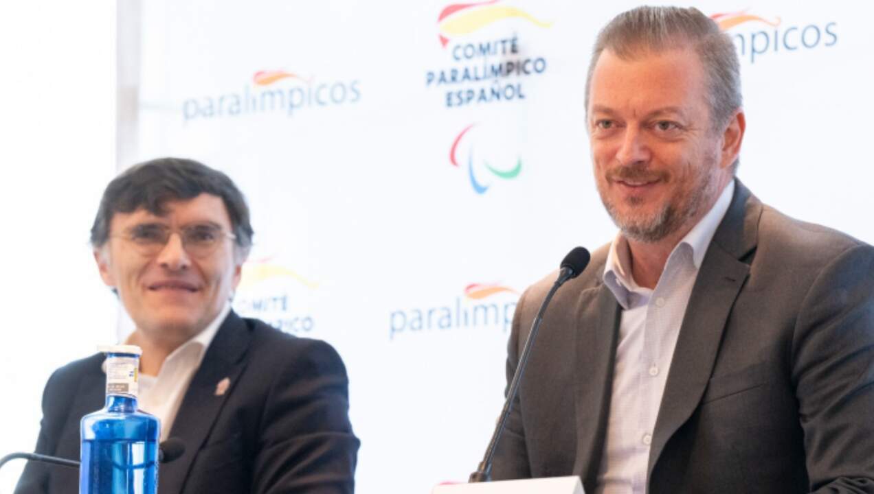 Alberto Durán, presidente del CPE, y Andrew Parsons, presidente del Comité Paralímpico Internacional, analizan juntos en una rueda de prensa la visita de este último a nuestro país. En sus declaraciones, abordan temas clave como la organización de competiciones internacionales en España y la reciente decisión de la Federación Internacional de Atletismo Paralímpico sobre el caso de la medalla de Elena Congost.