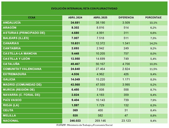 Así, en el último año el número de autónomos en pluriactividad ha aumentado un 9,4%, pasando de los 246.023 autónomos en esta situación en abril de 2024 a 269.146 en abril de 2025, lo que en términos absolutos se traduce en 23.123 autónomos que cotizan a otro régimen además del RETA. Todas las comunidades autónomas registraron un crecimiento del número de autónomos en situación de pluriactividad.