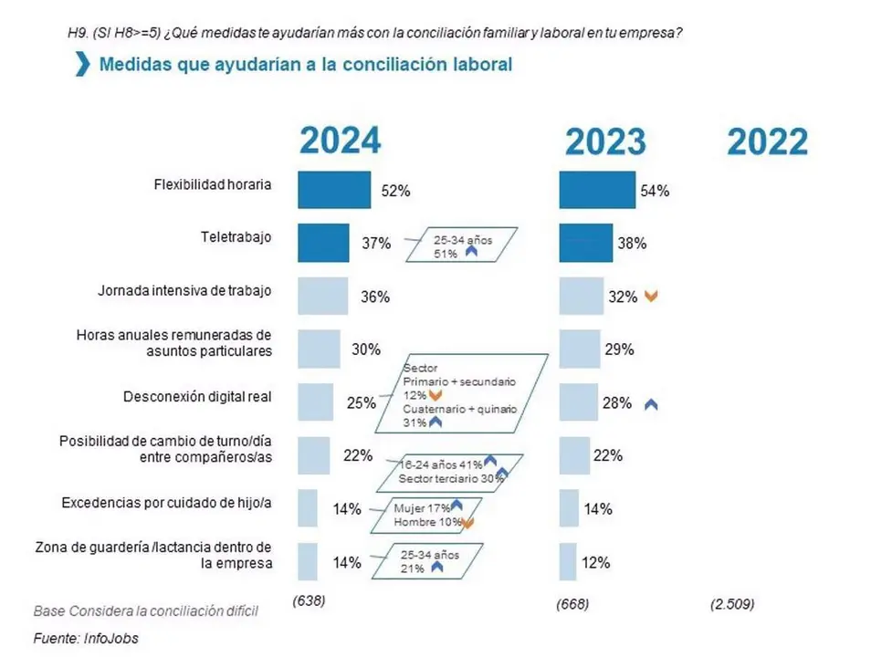 De acuerdo con los datos de la encuesta de InfoJobs, entre las medidas más valoradas por los trabajadores para lograr la conciliación, la flexibilidad laboral se sitúa en primera posición. Más de la mitad de los encuestados así lo indica (52%), siguiendo la línea de años anteriores --54%, obtenido en 2023; y 53% en 2022--. A esta, le sigue el teletrabajo, con el 37%; y la jornada intensiva (36%).