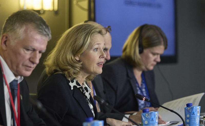 La vicepresidenta primera del Gobierno y ministra de Economía y Transformación Digital de España, Nadia Calviño (2i), interviene en el Comité de Economía y Seguridad en la Asamblea Parlamentaria de la OTAN - Jesús Hellín - Europa Press