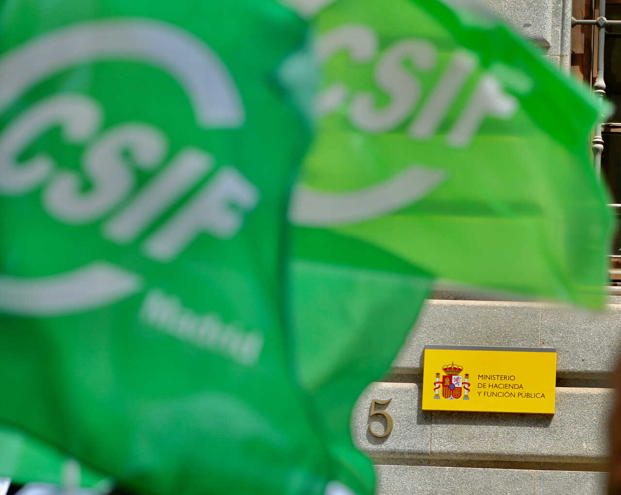 Archivo - Banderas la Central Sindical Independiente y de Funcionarios (CSIF) frente al Ministerio de Hacienda y Función Pública durante una protesta, a 22 de junio de 2022, en Madrid (España).