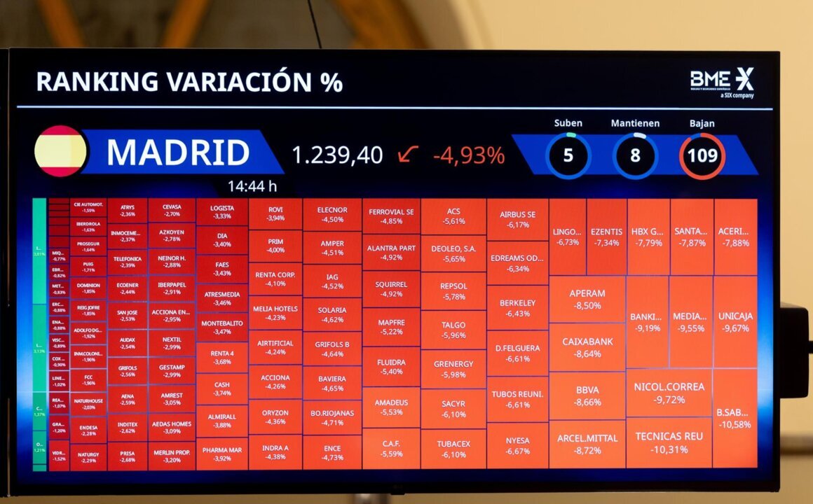 El Ibex 35 acumula desde el jueves una caída del 10,7%, lo que prácticamente ha eliminado todas las ganancias del año, como consecuencia de la incertidumbre y la volatilidad generada por los aranceles generalizados que anunció la semana pasada el presidente de Estados Unidos, Donald Trump.