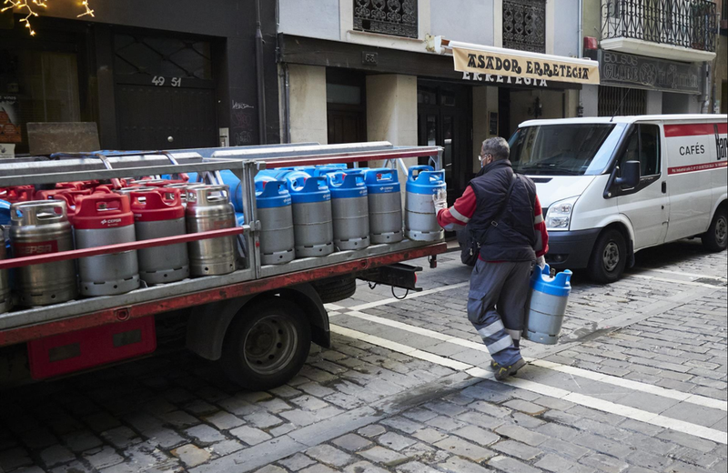 Un repartidor deja bombonas de butano a un bar en Pamplona. Fuente: Europa Press