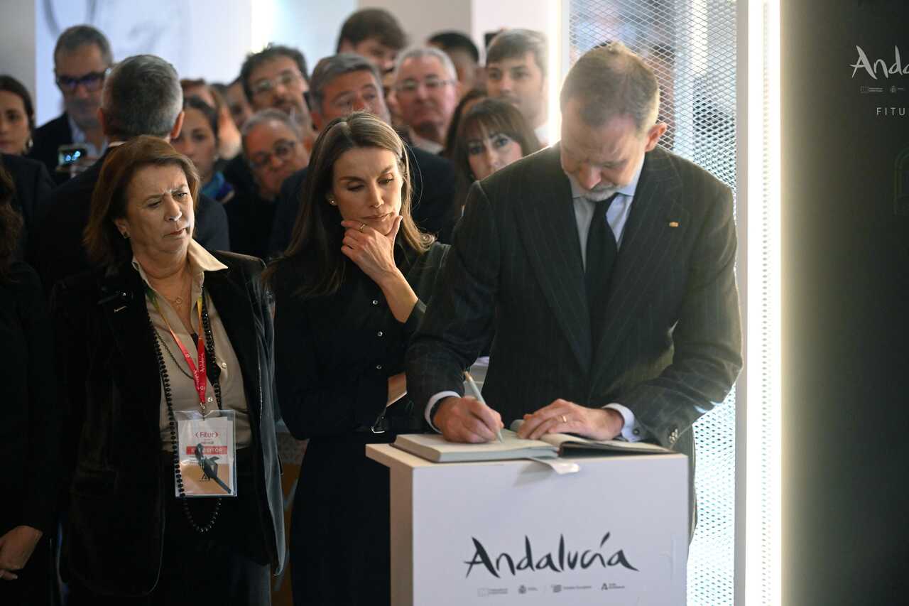 La Reina Letizia y el Rey Felipe firman en el libro de condolencias por el accidente de Adamuz durante la inauguración oficial de la 46ª edición de la Feria Internacional de Turismo (FITUR), en IFEMA Madrid, a 22 de enero de 2026, en Madrid (España).