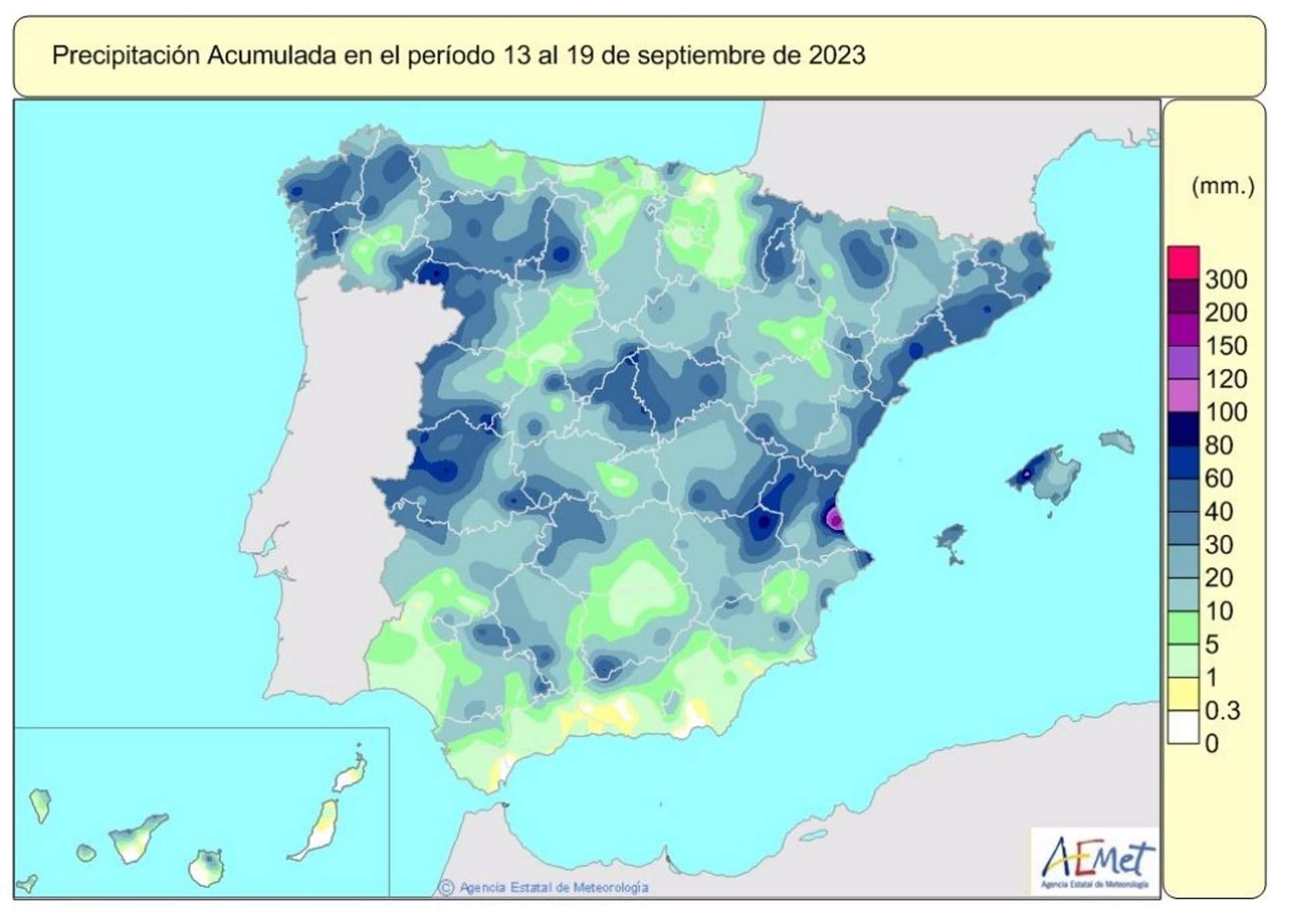 Todo ello a pesar de que durante el periodo entre el 13 y el 19 de septiembre se registraron precipitaciones en toda España exceptuando a las islas Canarias más orientales así como el sur de las islas de Gran Canaria y Tenerife.