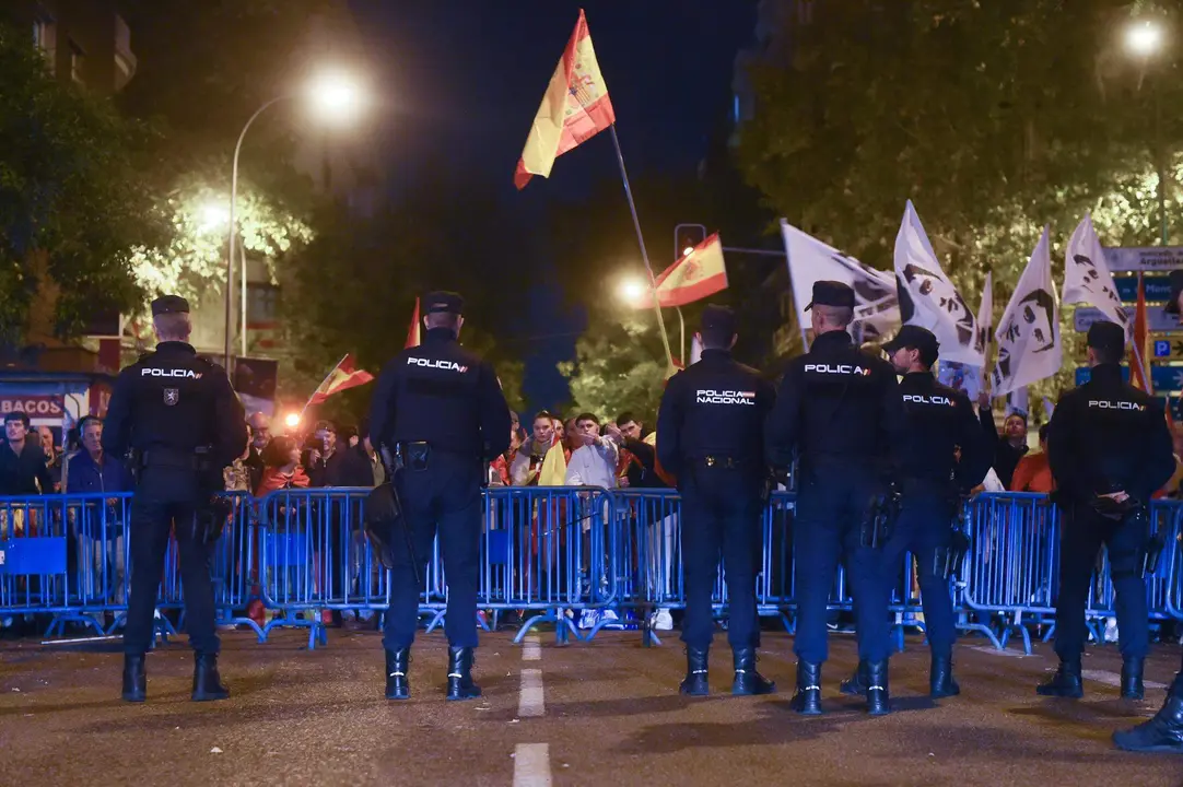 Más tarde, alrededor de las 19.00 horas, la Policía Nacional ha comenzado a blindar la zona al crecer la tensión y sobrepasar los límites de la acera, desde la esquina de Marqués de Urquijo, donde se han concentrado este sábado cuando precisamente se cumplen 16 días desde que empezaran las concentraciones.