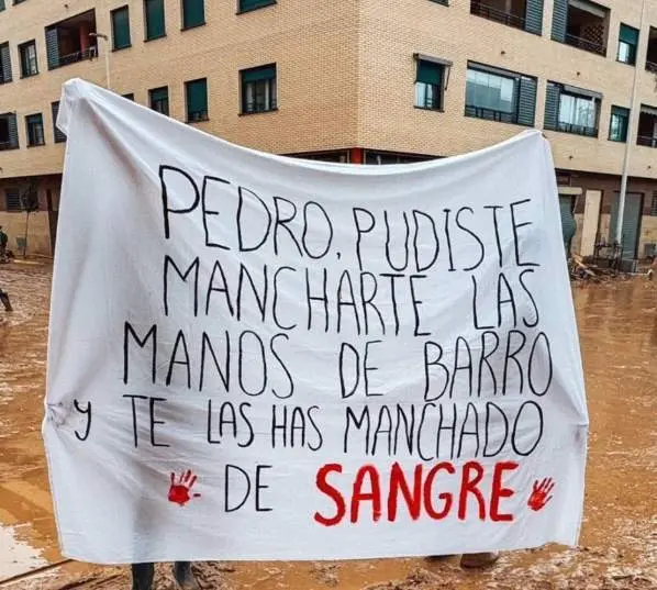 El mensaje está acompañado de una imagen en la que se ve una sábana blanca en la que se lee "Pedro, pudiste mancharte las manos de barro y te las has manchado de sangre".