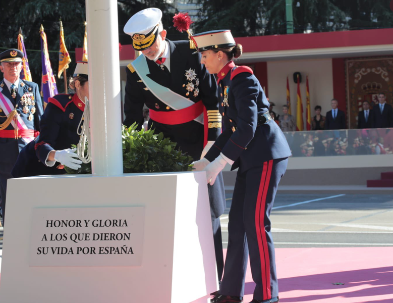 Los monarcas han recibido después honores militares y Felipe VI ha pasado revista a las tropas, tras lo que ha saludado a las autoridades. Después ha tenido lugar el tradicional salto paracaidista con la bandera de España y tras ello el izado de la bandera y acto de homenaje a los caídos por España.