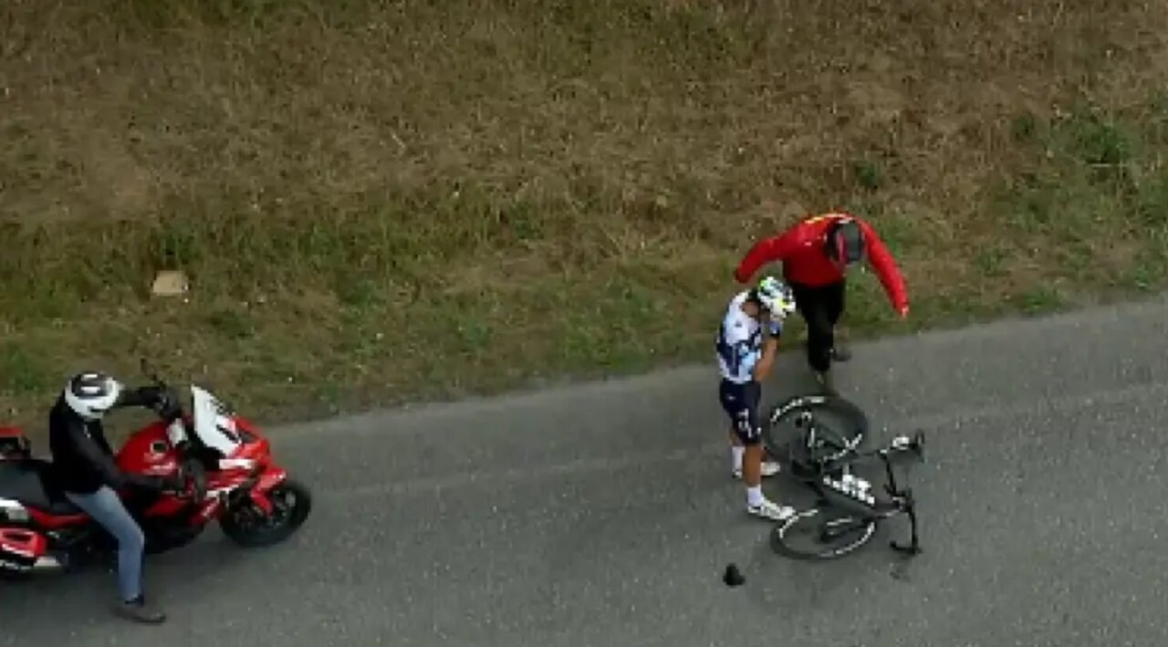 Un activista propalestino tira a Javi Romo en plena etapa de La Vuelta