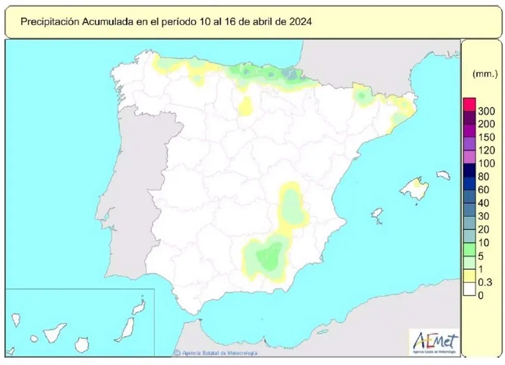 En concreto, están especialmente bajas en una franja en el levante peninsular que va desde Almería hasta el delta del Ebro, donde se ha registrado menos de una cuarta parte de la precipitación respecto a su valor medio para el periodo 1991-2020. A su vez, están por debajo de la media en ambos archipiélagos.
