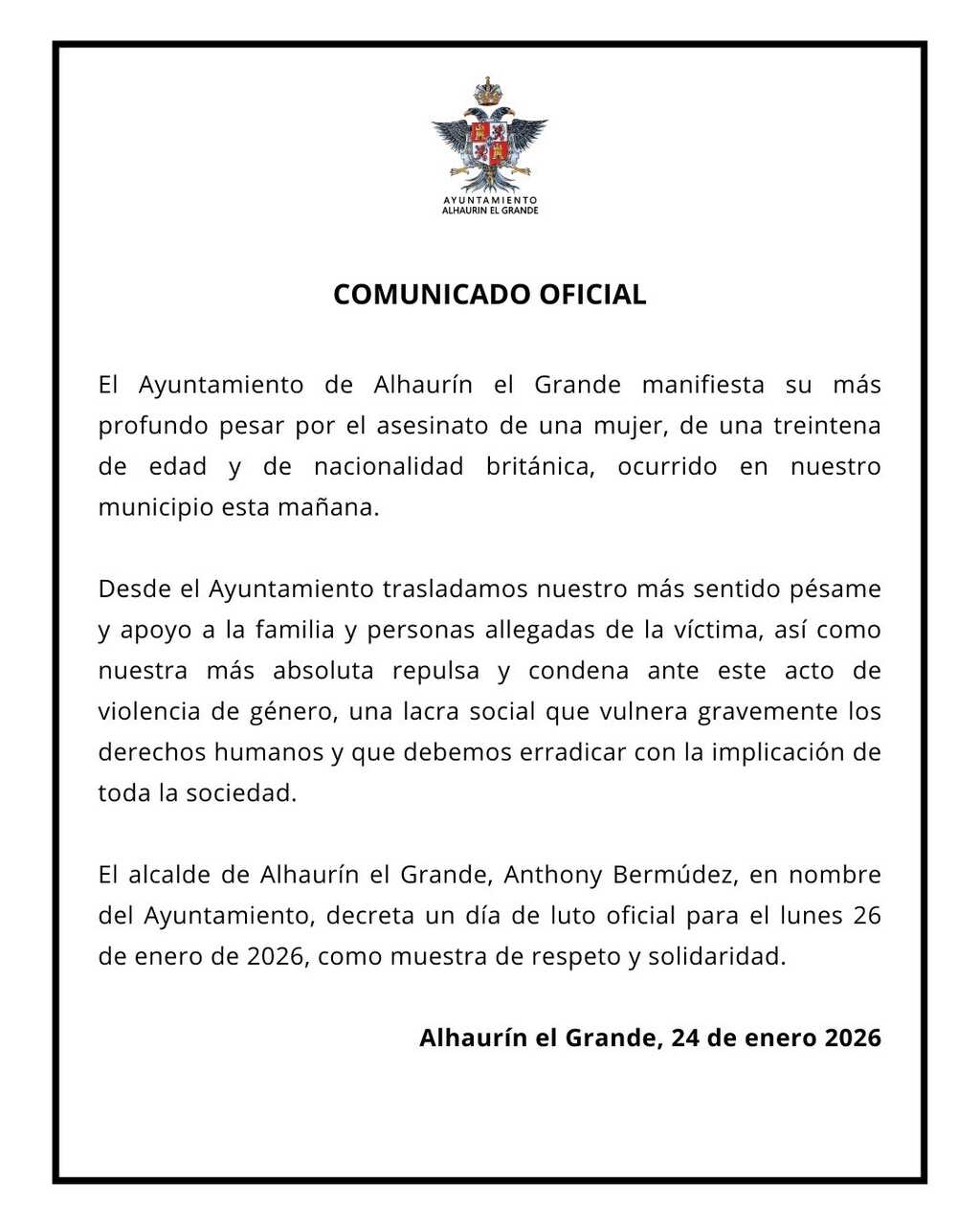 El alcalde de Alhaurín el Grande (Málaga), Anthony Bermudez, ha decretado el lunes 26 de enero como día de luto oficial en la localidad, “como muestra de respeto y solidaridad”, tras un presunto caso de violencia de género ocurrido este sábado en este municipio del Valle del Guadalhorce.