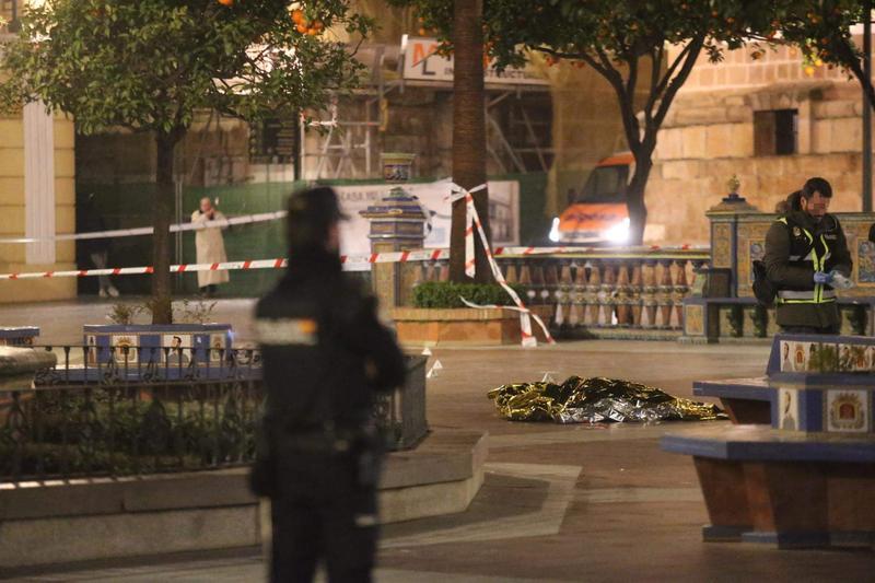 El cadáver de Diego Valencia en la plaza Alta en la noche del miércoles tras el ataque a dos iglesias en Algeciras