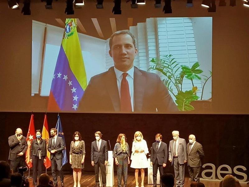 En el acto han tomado también la palabra la presidenta de la Comunidad de Madrid, Isabel Díaz Ayuso, y el alcalde de Madrid, José Luis Martínez Almeida. Además, ha asistido el líder de los 'populares', Pablo Casado, que ha posado con todos ellos al inicio del acto, al que Guaidó se ha conectado por vía telemática.