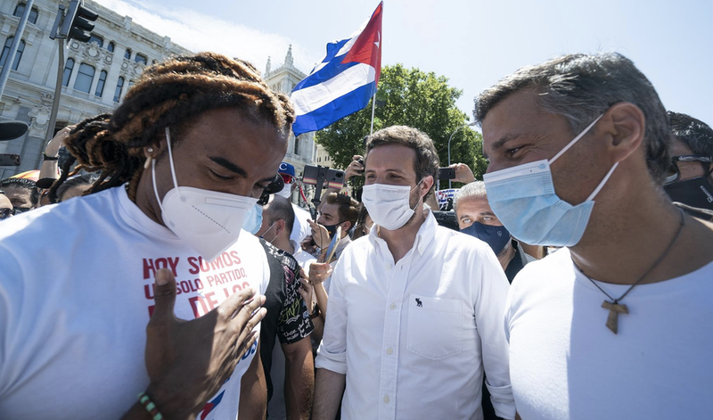 El presidente del PP, Pablo Casado, ha asistido este domingo a la 'Marcha por Cuba' que ha tenido lugar a las 14.00 horas en Madrid, donde ha mostrado su apoyo al pueblo cubano.