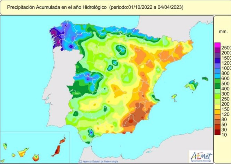 La falta de lluvias acumulada desde el inicio del año hidrológico (el 1 de octubre de 2022) hasta el 4 de abril se sitúa en un 19% por debajo del valor normal, ya que se ha recogido una media de 334 litros por metro cuadrado en el conjunto de España cuando lo normal para este periodo son 411 litros por metro cuadrado, según la Agencia Estatal de Meteorología (AEMET).