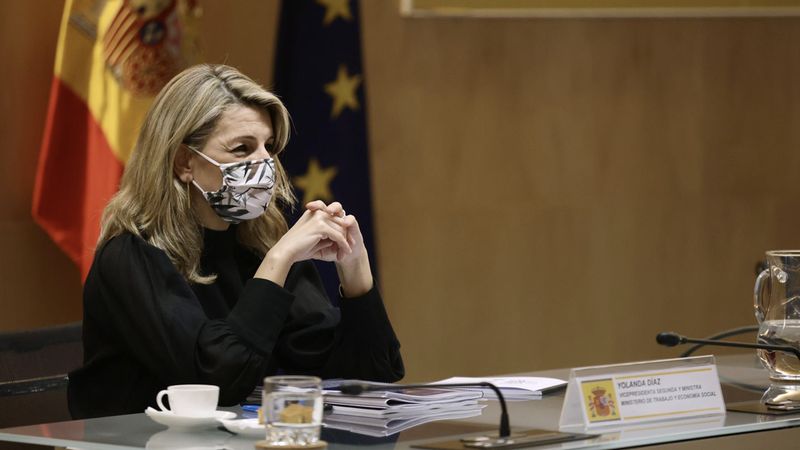 La vicepresidenta segunda y ministra de Trabajo y Economía Social, Yolanda Díaz, en una reunión de la Mesa de Diálogo Social para el Plan de Recuperación, Transformación y Resiliencia, en el Ministerio de Asuntos Económicos y Transformación Digital. - Eduardo Parra - Europa Press