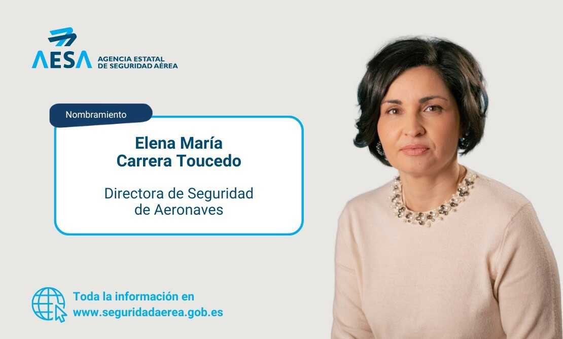 La Agencia Estatal de Seguridad Aérea (AESA) anunció la designación de Elena María Carrera Toucedo como nueva directora de Seguridad de Aeronaves. Cuenta con una trayectoria de más de quince años dentro de la agencia.