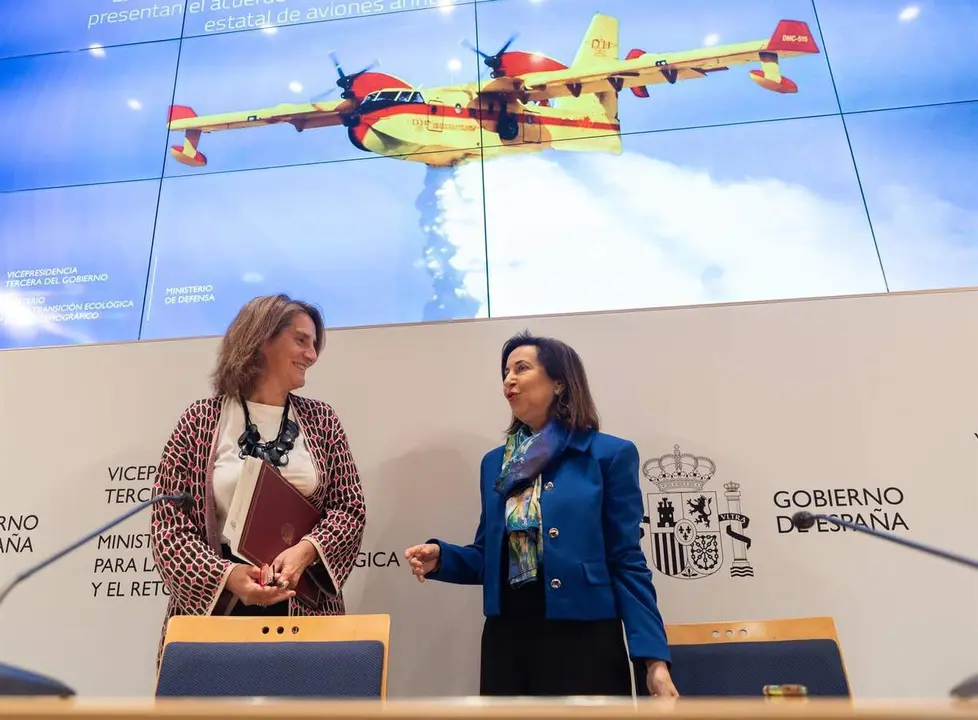 La vicepresidenta tercera del Gobierno y ministra para la Transición Ecológica y el Reto Demográfico (MITECO), Teresa Ribera, y la de Defensa, Margarita Robles, han firmado este viernes 19 de abril un acuerdo interdepartamental para la adquisición de siete aviones anfibios de lucha contra incendios forestales por un valor total 375 millones de euros.