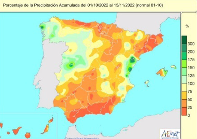 Las lluvias acumuladas en el conjunto de España desde que comenzó el año hidrológico el 1 de octubre hasta el 17 de noviembre han alcanzado un 76 litros por metro cuadrado, lo que supone un 33 por ciento menos de lo normal para este periodo, que son 114 litros por metro cuadrado, según la Agencia Estatal de Meteorología (AEMET).