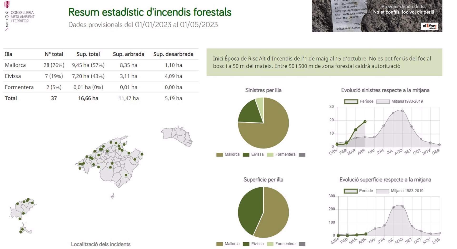 Según los datos aportados por el Ibanat este lunes, en total se han producido 37 incendios en Baleares hasta el 1 de mayo, de los que 28 se han dado en Mallorca, siete en Ibiza y dos en Formentera.