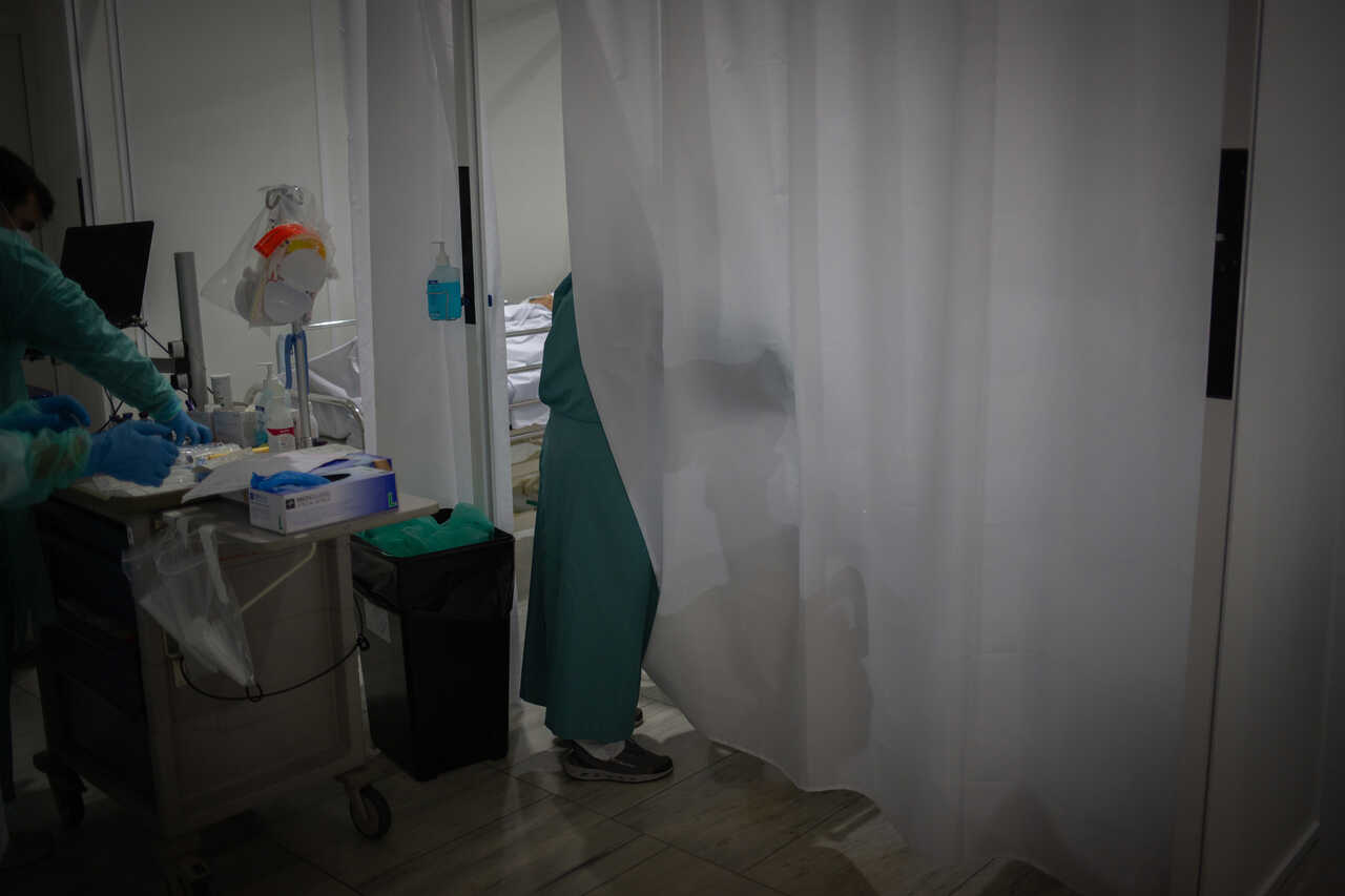 Un sanitario visita a uno de los enfermos ingresado en uno de los boxes de la Unidad de Cuidados Intensivos –UCI- del Hospital de la Santa Creu i Sant Pau, integrado en la Red Hospitalaria de Utilización Pública de Catalunya, en Barcelona.