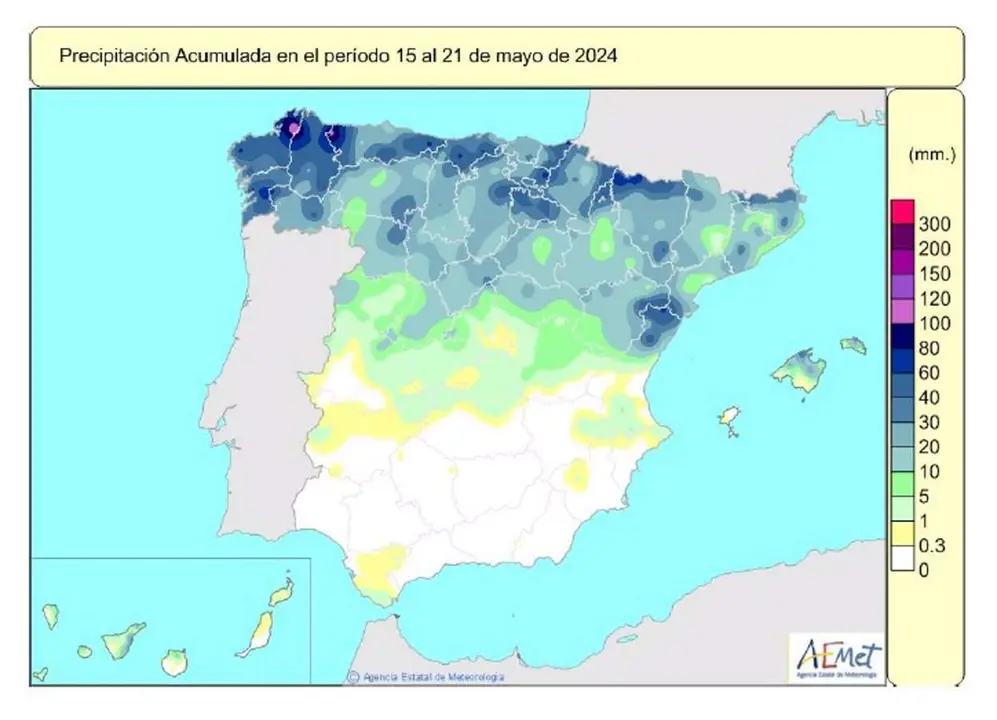 En este sentido, AEMET ha señalado que las precipitaciones durante el periodo del 15 al 21 de mayo afectaron a la mitad norte peninsular y a ambos archipiélagos y fueron más abundantes en Galicia, en Asturias, en Cantabria, en la mitad este del País Vasco y en la Rioja, en el Pirineo más occidental y alrededor del delta del Ebro. En concreto, ha especificado que las precipitaciones más destacadas superaron los 100 l/m2 en puntos del litoral norte de la comunidad gallega.