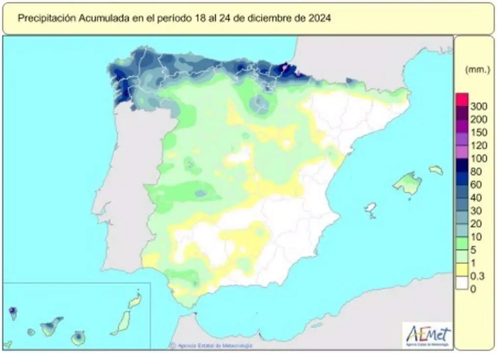 En su resumen de la evolución de las precipitaciones en España, AEMET ha detallado que durante el periodo que va del 18 al 24 de diciembre que las precipitaciones afectaron a gran parte del territorio peninsular así como a ambos archipiélagos, salvo al tercio este y al cuadrante sureste de la Península. En concreto, alcanzaron los 10 l/m2 en puntos de Galicia y en toda la cornisa cantábrica además de en el norte de la isla de Mallorca y en las islas canarias de mayor relieve. Además, superaron los 100 l/m2 en zonas puntuales del pirineo navarro y al norte de la isla de la Palma.