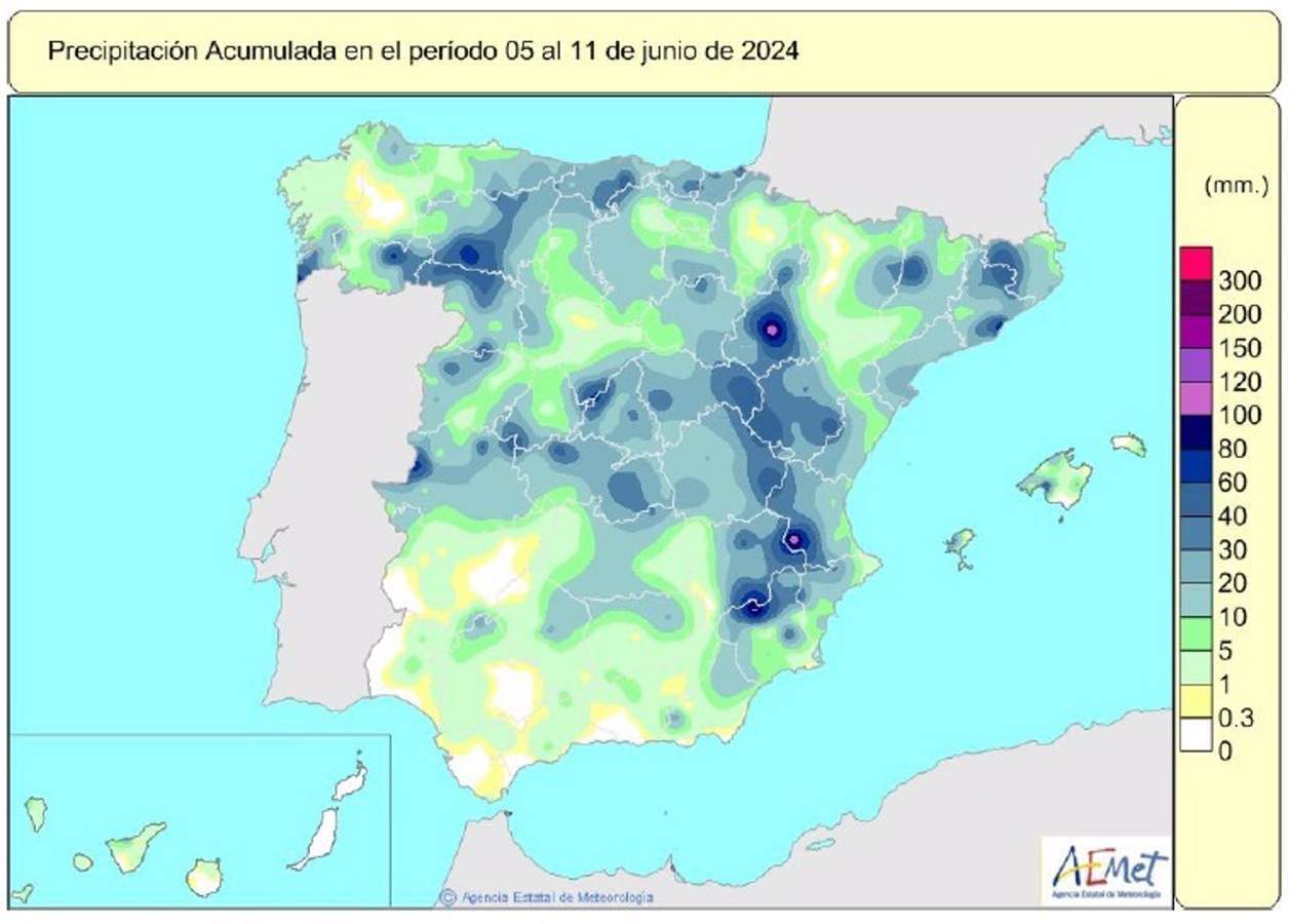 En este sentido, AEMET ha señalado que las precipitaciones que se registraron entre el 5 y el 11 de junio afectaron a toda la Península y archipiélagos con las excepciones de las islas de Fuerteventura y Lanzarote y puntos más aislados del cuadrante suroeste peninsular. Entre ellas, las más destacadas se dieron sobre todo en el tercio este peninsular, con algunos puntos aislados que superaron los 100 l/m2, tal y como sucedió en el interior de Aragón y en puntos limítrofes entre las provincias de Albacete y Valencia.