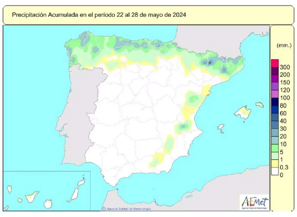 En este sentido, AEMET ha señalado que las precipitaciones que se registraron durante el periodo entre el 22 y el 28 de mayo afectaron al tercio norte peninsular, a puntos más aislados del Levante y en menor medida al archipiélago balear y a las islas canarias más occidentales. En concreto, ha especificado que las precipitaciones más destacadas apenas superaron los 10 l/m2 en zonas de Galicia, en la cordillera cantábrica, en el pirineo gerundense e interior de Cataluña y en el noreste de Albacete.