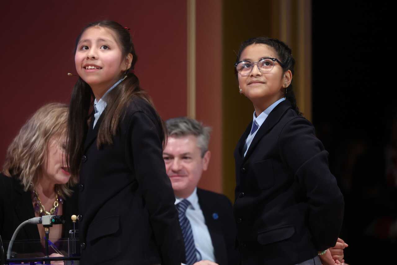 Dos niñas del Colegio de San Ildefonso, cantan el primer premio de la Lotería de Navidad, durante la celebración del Sorteo Extraordinario de la Lotería de Navidad 2025, en el Teatro Real, a 22 de diciembre de 2025, en Madrid (España).