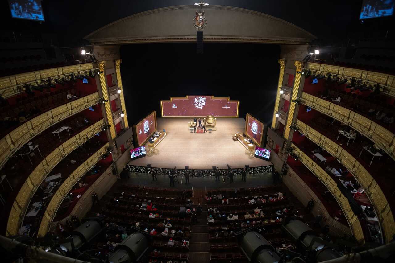 Varias personas ven como los niños del Colegio de San Idefonso cantan los números premiados durante la celebración del Sorteo Extraordinario de la Lotería de Navidad 2025, en el Teatro Real, a 22 de diciembre de 2025, en Madrid (España). El Sorteo Extraor