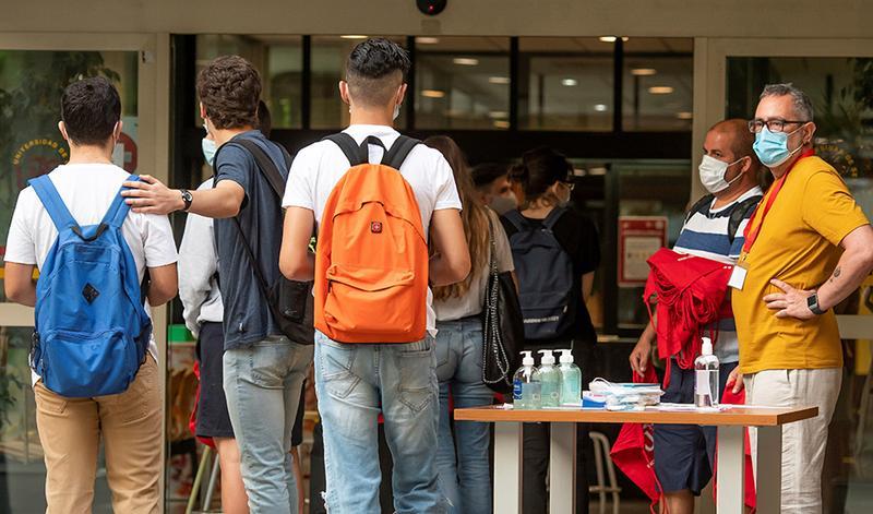GRAF3745. SEVILLA, 07/07/2020.- Un grupo de estudiantes de segundo de bachillerato a las puertas de la Escuela Técnica Superior de Ingeniería de la Construcción de Sevilla, uno de los muchos centros donde miles de jóvenes realizan a partir de este martes la Evaluación para el Acceso a la Universidad (EvAU). EFE/ Raúl Caro
