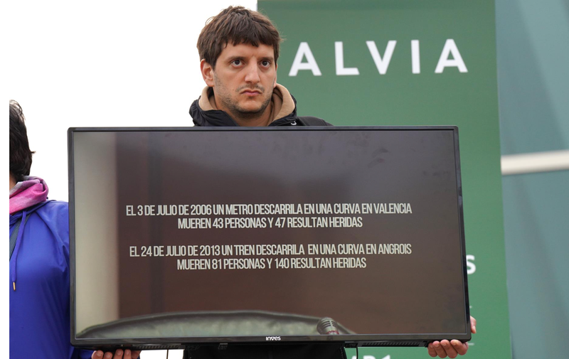 Un familiar de una víctima en el accidente de Alvia sujeta una pantalla de televisión con una imagen del exdirector de Seguridad en la circulación de Adif, Andrés Cortabitarte, mientras declara en el juicio por el accidente del Alvia, en la Cidade de la C - Álvaro Ballesteros - Europa Press