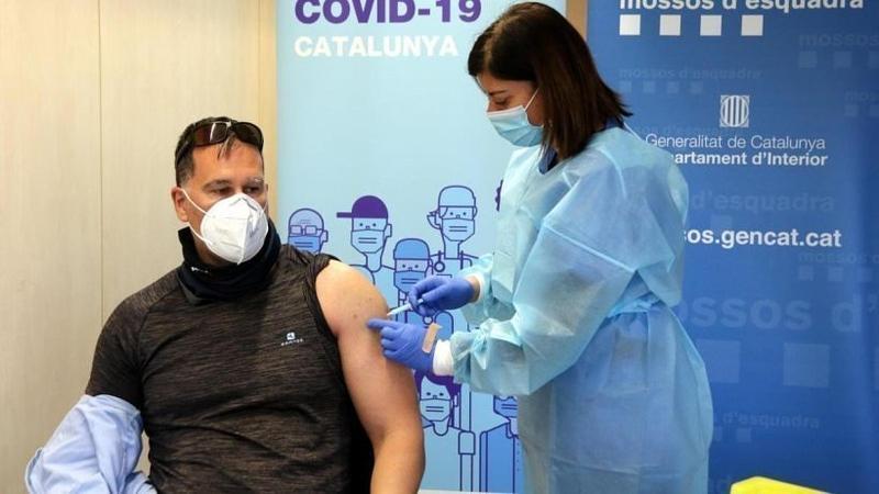 Una enfermera vacuna a un policía en Cataluña. Twitter