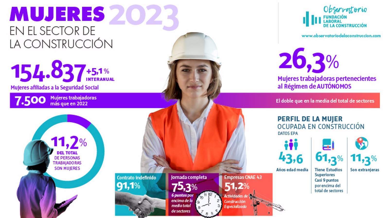 Las mujeres han alcanzado el 11,2% de representación laboral en el sector de la construcción tras haber sumado 7.500 trabajadoras en 2023, según el informe 'Mujeres en el sector de la Construcción 2023' de la Fundación Laboral de la Construcción.